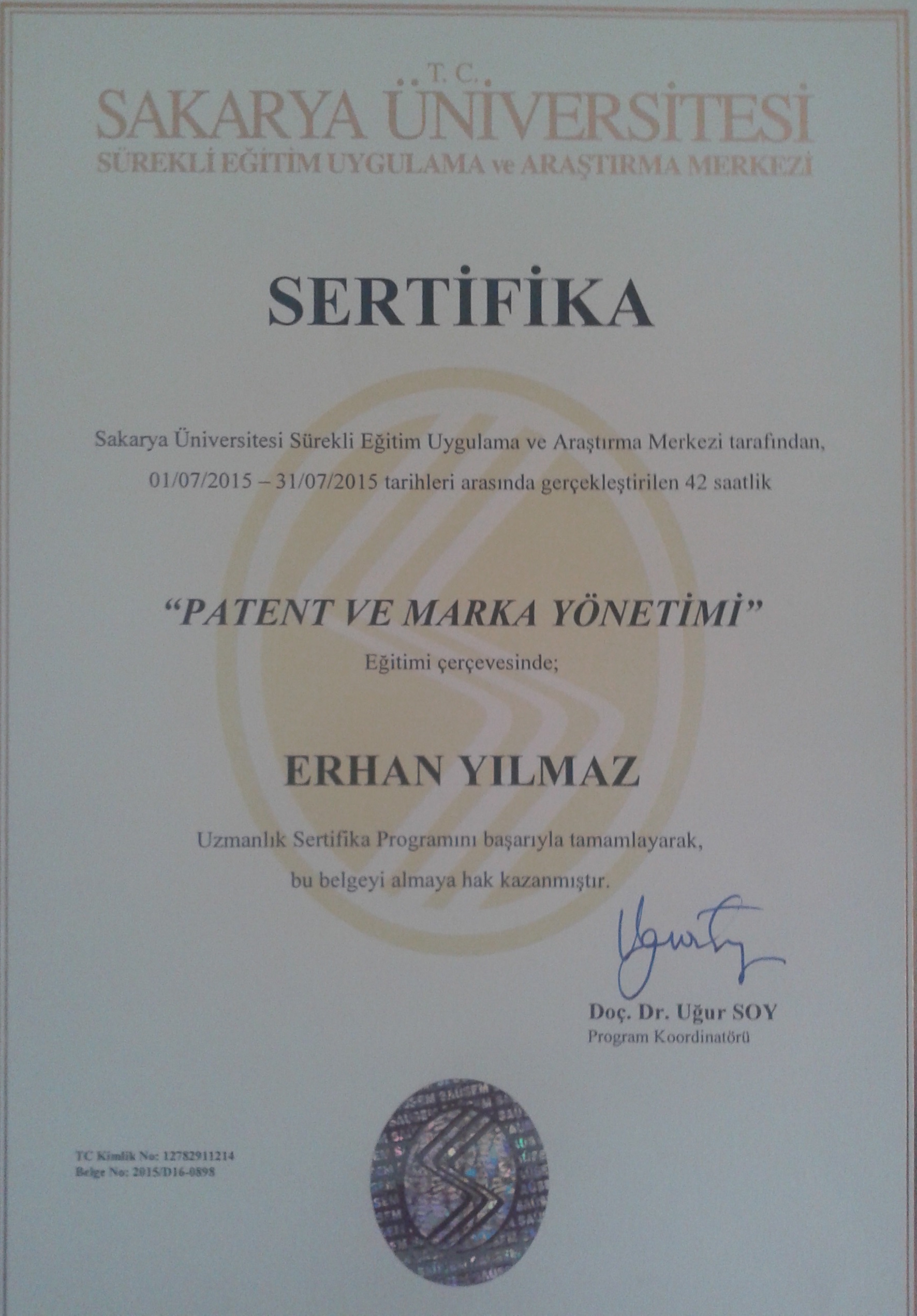 "Patent ve Marka Yönetimi Uzmanlık Sertifikası" sahibi olarak Fikri ve Sınai Haklar konusunda her türlü hukuki işlem yapılır ve danışmanlık hizmeti verilir.